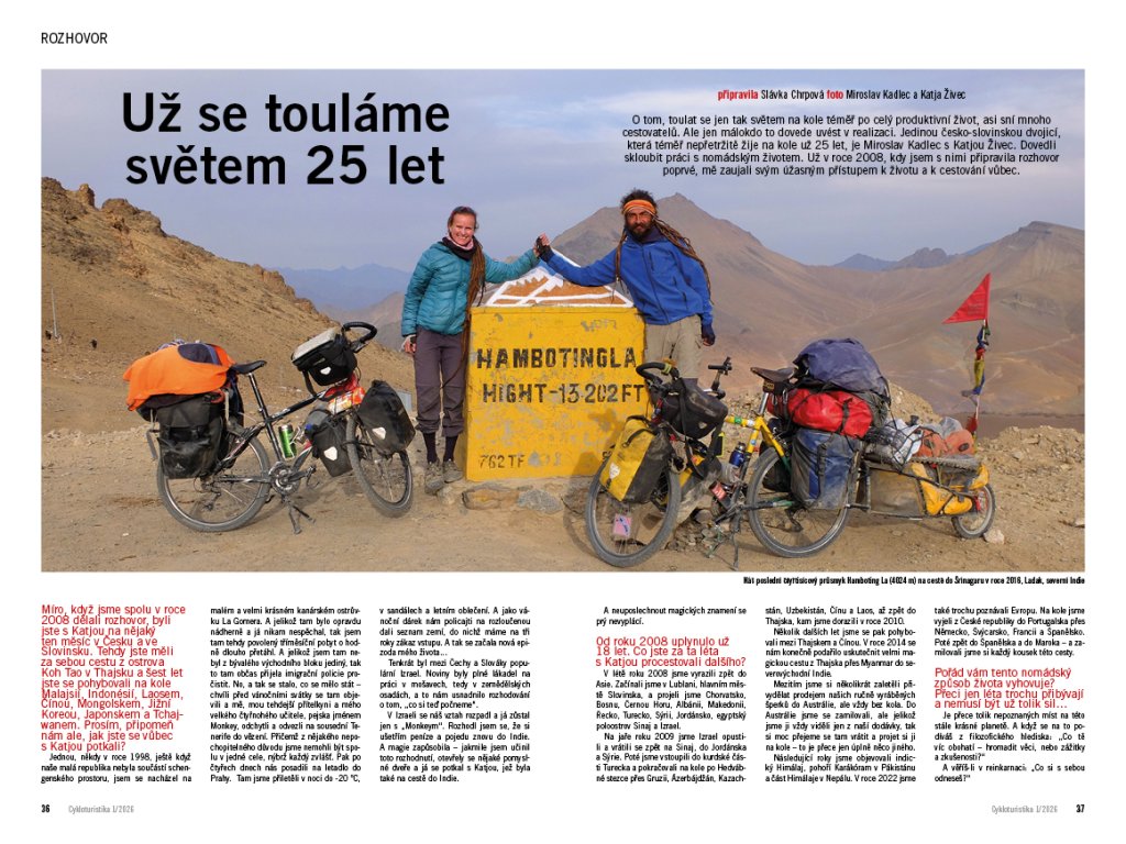 S jedinou česko-slovinskou dvojicí, která téměř nepřetržitě žije na kole už 25 let - Miroslavem Kadlecem s Katjou Živec - a která dovedla skloubit práci s nomádským životem, jsme připravili komlexní rozhovor.